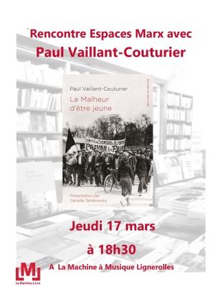 – le Jeudi 17 mars à 18h30 à 20h Rencontre trimestrielle d’Espaces Marx à La Librairie La Machine à Lire à Bordeaux, autour du livre « Le malheur d’être jeune »(1935)de Paul Vaillant-Couturier, réédité par les Editions du Détour, avec la participation de Danielle TARTAKOWSKI, à l’origine de la Préface de cette réédition qui dialoguera avec Arthur HAY, jeune coursier à vélo….